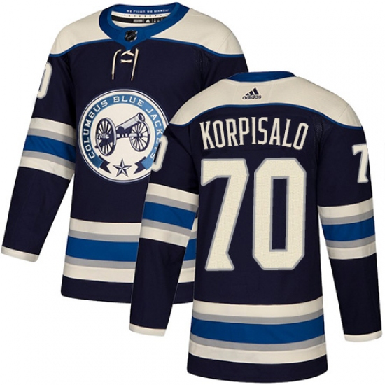 >Men's Adidas Columbus Blue Jackets #70 Joonas Korpisalo Authentic Navy Blue Alternate NHL Jersey