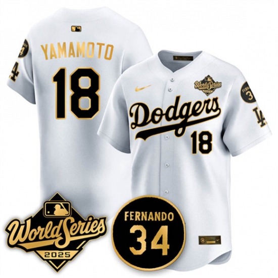 Men's Los Angeles Dodgers #18 Yoshinobu Yamamoto White Gold 2025 World Series With No.34 Limited Stitched Baseball Jersey