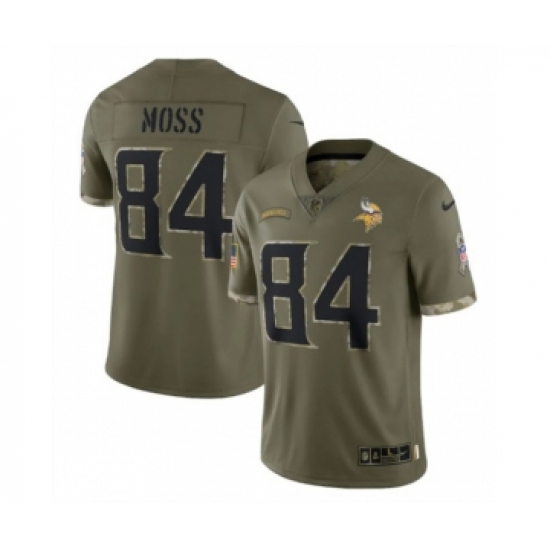 >Men's Minnesota Vikings #84 Randy Moss 2022 Olive Salute To Service Limited Stitched Jersey