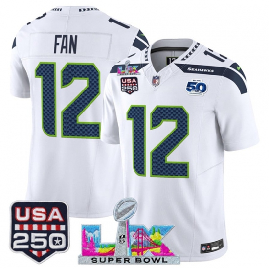 Men's Seattle Seahawks #12 Fan White 2025 F.U.S.E. Super Bowl LX And 50th Season & USA 250 Vapor Limited Football Stitched Jersey