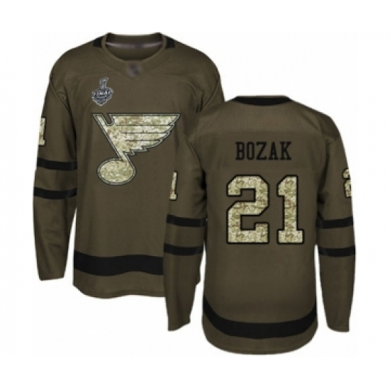 >Men's St. Louis Blues #21 Tyler Bozak Authentic Green Salute to Service 2019 Stanley Cup Final Bound Hockey Jersey