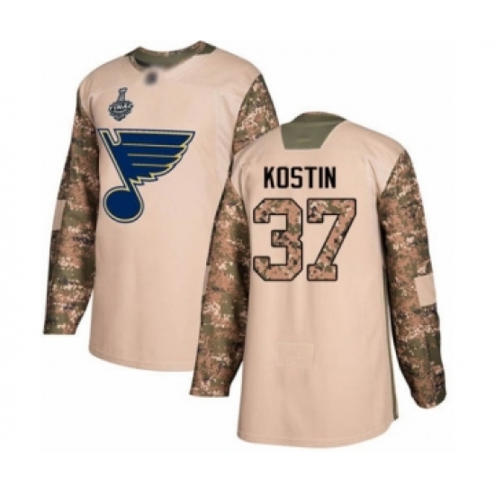 >Men's St. Louis Blues #37 Klim Kostin Authentic Camo Veterans Day Practice 2019 Stanley Cup Final Bound Hockey Jersey