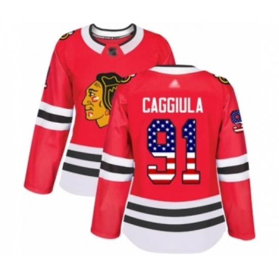 >Women's Chicago Blackhawks #91 Drake Caggiula Authentic Red USA Flag Fashion Hockey Jersey
