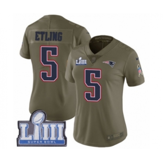 >Women's Nike New England Patriots #5 Danny Etling Limited Olive 2017 Salute to Service Super Bowl LIII Bound NFL Jersey