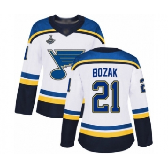 Women's St. Louis Blues #21 Tyler Bozak Authentic White Away 2019 Stanley Cup Champions Hockey Jersey