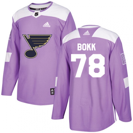 >Youth Adidas St. Louis Blues #78 Dominik Bokk Authentic Purple Fights Cancer Practice NHL Jersey