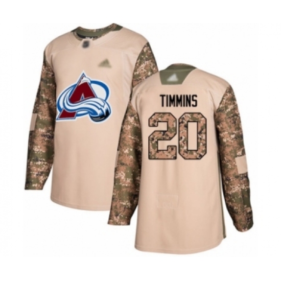 >Youth Colorado Avalanche #20 Conor Timmins Authentic Camo Veterans Day Practice Hockey Jersey