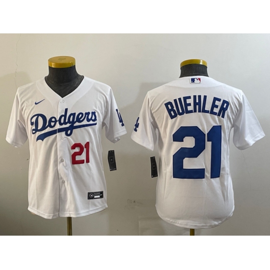 Youth Los Angeles Dodgers #21 Walker Buehler Number White Stitched Cool Base Nike Jersey