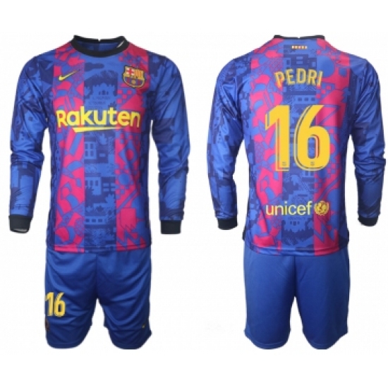 >Men 2021-2022 Club Barcelona Second away blue Long Sleeve 16 Soccer Jersey