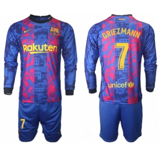 >Men 2021-2022 Club Barcelona Second away blue Long Sleeve 7 Soccer Jerseys