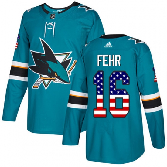 >Men's Adidas San Jose Sharks #16 Eric Fehr Authentic Teal Green USA Flag Fashion NHL Jersey