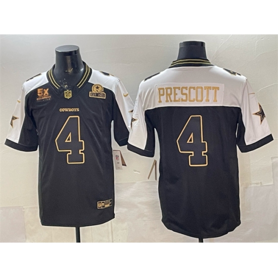 Men's Dallas Cowboys #4 Dak Prescott Black Gold 2025 F.U.S.E. With 5x Super Bowl Champions & Established In 1960 Vapor Limited Stitched Football Jersey
