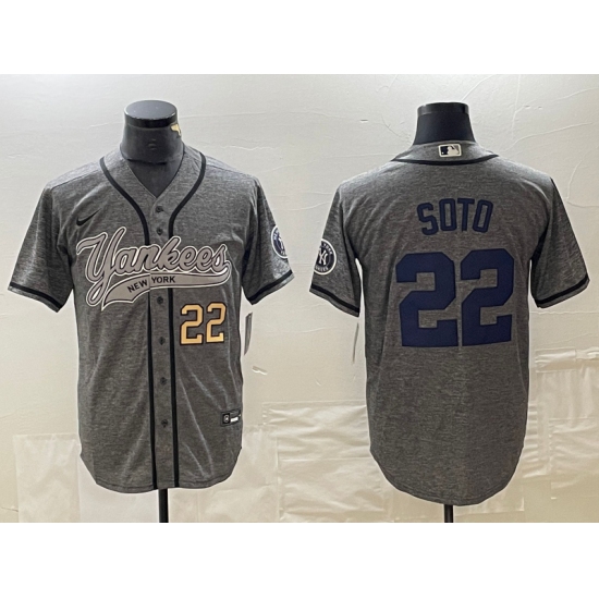 >Men's New York Yankees #22 Juan Soto Number Grey Gridiron Cool Base Stitched Baseball Jersey