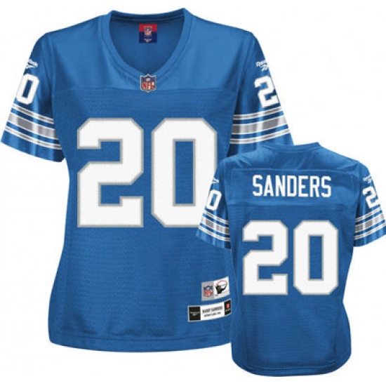 The Reebok Detroit Lions #20 Barry Sanders Blue Women's Throwback Team Color Replica Throwback NFL Jersey by Reebok® is made with quick-drying nylon mesh and designed with screen-printed player and team graphics on the chest, back, sleeves and shoulders. 100% polyester diamond back mesh body, Polyester dazzle sleeves and yoke, Player's number screen-printed on the chest, back and sleeves, Player's name screen-printed at the upper back on a sewn down nameplate, Flat-knit collar with NFL® Equipment patch sewn at the point in the front, Woven jock tag shown at lower left front above the hem, Decorated in the team colors, Officially licensed