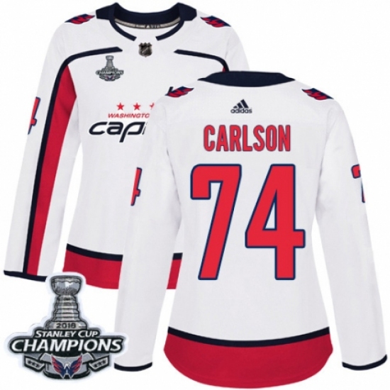 >Women's Adidas Washington Capitals #74 John Carlson Authentic White Away 2018 Stanley Cup Final Champions NHL Jersey