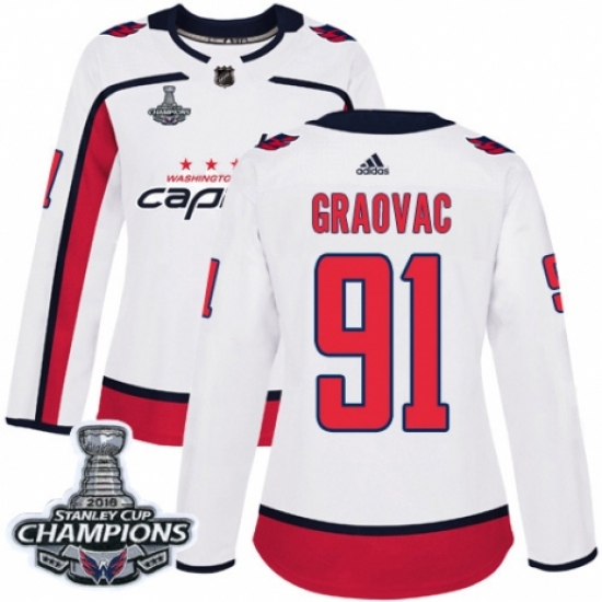 Women's Adidas Washington Capitals #91 Tyler Graovac Authentic White Away 2018 Stanley Cup Final Champions NHL Jersey