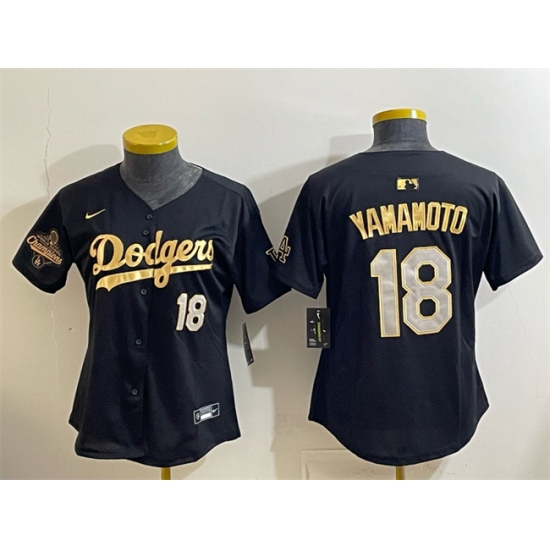 >Youth Los Angeles Dodgers #18 Yoshinobu Yamamoto Black Gold 2025 World Series Champions Limited Stitched Baseball Jersey
