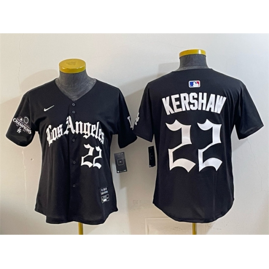 >Youth Los Angeles Dodgers #22 Clayton Kershaw Black 2025 World Series Champions LA Gothic Edition Limited Stitched Baseball Jersey
