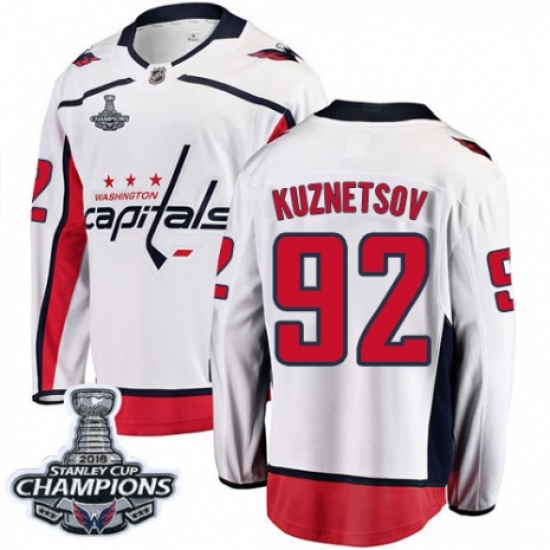 >Youth Washington Capitals #92 Evgeny Kuznetsov Fanatics Branded White Away Breakaway 2018 Stanley Cup Final Champions NHL Jersey